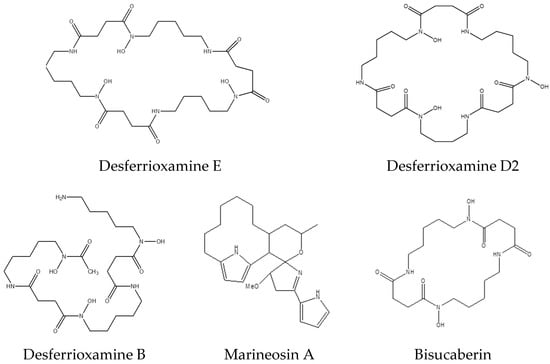 - Kameyama, T.; Takahashi, A.; Kurasawa, S.; Ishizuka, M.; Okami, Y.; Takeuchi, T.; Umezawa, H. Bisucaberin, a new siderophore, sensitizing tumor cells to macrophage-mediated cytolysis. I. Taxonomy of the producing organism, isolation and biological properties. J. Antibiot. 1987, 40, 1664–1670. [Google Scholar] [CrossRef] [Green Version]