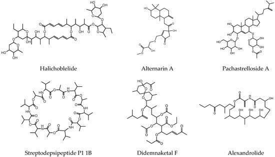 Mining the Marinlit database for molecules detected by LC-MS/MS with high UV absorbance led to identifying additional molecules (Figure 4, Table S2). The ion peak at m/z 1039.578 [M + H]+ was dereplicated as the macrolide halichoblelide previously identified in Streptomyces hygroscopicus and that possessed cytotoxic activity [50]. The ion at m/z 1083.606 [M + H]+ was dereplicated as streptodepsipeptide P11B, a cyclodepsipeptide previously isolated from the marine Streptomyces sp. P11-23B, which proved to be cytotoxic against various glioma cell lines [51]. The mass ion peak at m/z 495.240 [M + H]+ was dereplicated as alternarin A, a drimane meroterpenoid that was recently characterized in coral-associated Alternaria sp. ZH-15 as a neuronal excitability suppressant [52]. The ion peak at m/z 528.352 [M + H]+ was identified as the diatom growth inhibitor alexandrolide, which was previously isolated from the dinoflagellate Alexandrium catenella [53]. The mass ion peak at m/z 783.453 [M + H]+ was dereplicated as pachastrelloside A, which was characterized in a marine sponge from the genus Pachastrella [54]. Finally, the mass ion peak at m/z 853.495 [M + H]+ was dereplicated as didemnaketal F, an antimicrobial metabolite reported from the ascidian Didemnum sp. with potent antimicrobial activity against E. coli and the fungus Candida albicans. Didemnaketal F also displayed moderate activity against HeLa cells [55]. It is noteworthy that the metabolites shown in (Figure 4), including alternarin A, alexandrolide, pachastrelloside A, and didemnaketal F, are reported here for the first time in the genus Streptomyces.