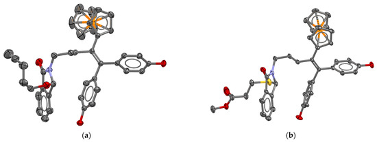 From compound 18 (0.305 g, 0.52 mmol) and methyl 3-mercaptopropionate (0.219 g, 1.8 mmol), reaction time of 4 h. Eluent: cyclohexane/ethyl acetate 2: 1. Yield of 83%. 1H NMR (acetone-d6): δ 1.79–1.96 (m, 2H, CH2), 1.99–2.28 (m, 4H, SCH2CH2COO), 2.48–2.76 (m, 2H, CH2-C=C), 3.19–3.33 (m, 1H, CH2N), 3.56 (s, 3H, OMe), 3.74–3.78 (m, 1H, C5H4), 3.90–4.15 (m, 2H, CH2N + C5H4), 4.05–4.16 (m, 7H, 2C5H4 + Cp), 4.91 (CH-S), 6.68 (d, J = 8.5 Hz, 2H, C6H4), 6.72 (d, J = 8.5 Hz, 2H, C6H4), 6.85 (d, J = 8.5 Hz, 2H, C6H4), 7.01 (d, J = 8.5 Hz, 2H, C6H4), 7.49–7.59 (m, 1H, isoindole), 7.63–7.77 (m, 3H, isoindole), 8.23 (s, 1H, OH), 8.35 (s, 1H, OH). 13C NMR (acetone-d6): δ 22.2 (CH2), 29.4 (CH2), 32.8 (CH2), 34.5 (CH2), 39.4 (CH2), 51.8 (OCH3), 63.1 (CH-S), 68.6 (CH C5H4), 68.7 (CH C5H4), 69.80 (CH C5H4), 69.85 (5CH Cp), 70.1 (CH C5H4), 88.4 (C C5H4), 115.7 (2CH C6H4), 116.1 (2CH C6H4), 123.5 (CH isoindole), 124.8 (CH isoindole), 129.7 (CH isoindole), 131.3 (2CH C6H4), 131.8 (2CH C6H4), 132.8 (CH isoindole), 132.9 (C), 134.6 (C), 136.8 (C), 137.2 (C), 139.3 (C), 144.7 (C), 156.69 (C), 156.74 (C), 167.6 (CO), 172.2 (COO). IR (ATR, ν cm−1): 1714 (CO), 1660 (CO). HRMS (ESI, C39H37FeNO5S: [M]+) calcd: 687.1736, found: 687.1736. Crystal data: C42H43FeNO6S, triclinic P -1, a = 10.7220(5) Å, b = 13.2436(6) Å, c = 15.3329(6) Å, α = 97.196(3)°, β = 103.916(4)°, γ = 113.797(4)°, V = 1872.10(16) Å3, Z = 2, orange plate 0.3 × 0.2 × 0.1 mm3, μ = 0.507 mm−1, min/max transmission = 0.57/1.00, T = 200 K, λ = 0.71073 Å, θ range = 1.74° to 28.28°, 25312 reflections measured, 9219 independent, Rint = 0.0892, completeness = 0.997, 471 parameters, 0 restraints, final R indices R1 [I > 2σ (I)] = 0.0630 and wR2 (all data) = 0.1676, GOF on F2 = 1.102, largest difference peak/hole = 1.52/−0.59 e·Å−3.