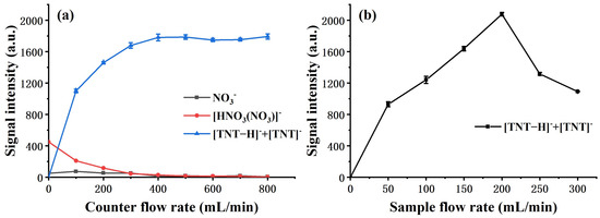 Figure 3b. As the sample flow rate increases, the initial increase in TNT signal intensity can be explained, as a larger flow can collect more TNT molecules from the thermal desorption sampler. The amount of analyte entering the reaction chamber will reach a maximum, as it will eventually be limited by the amount of sample introduced into the thermal sampler; further increase in sample flow leads to lower volume concentration and shorter retention time in the reaction chamber, resulting in a decrease in the measured signal. Therefore, in other experiments, the sample flow rates were all set to 200 mL/min.