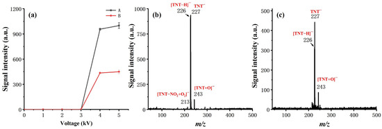 From the observed ion products, both electrode settings had a similar effect on soft ionization. Taking TNT as an example, in either case, the deprotonated molecular ion [M-H]− (m/z 226) and M− (m/z 227) dominated on the measured mass spectra, with minimal other fragment ions or adduct ions observed. The observed result eliminated our initial concern for the effect of soft ionization while applying HV on the inner electrode. We ascribed this to the spatial separation of the reaction chamber from the discharge region and the introduction of a counter flow design.