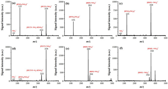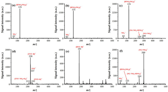 After the optimization of basic operating parameters, six typical explosive samples were tested by the system, including TNT, 2,4-DNT, NG, RDX, PETN, and HMX, to examine the ionization and determine the characteristic ion product. The molecular structure and measured mass spectra, with forward flow and counter flow as comparison, are shown in