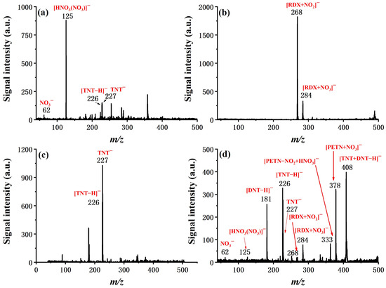 Figure 7, the ability of fast detection and discrimination of explosives from a mixture is demonstrated in four typical cases, which are the real explosive samples of Amatol and C-4, a simulated interference sample of TNT mixed with hand cream, and a mixture sample of TNT, 2,4-DNT, RDX, and PETN. Characteristic ion peaks for targeted explosives can be easily identified in all cases, suggesting the feasibility of applying the system in real sample analysis for field applications.