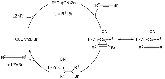 Proposed mechanism for the Cu(I)-catalyzed cross-coupling of 1-bromoalkynes with alkyl zinc reagents [24].