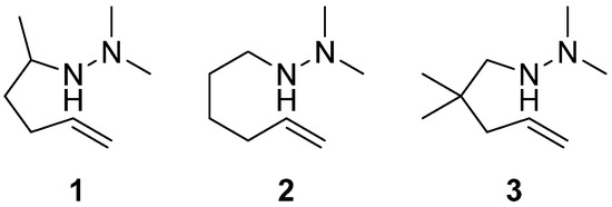Our investigation started with N,N-dimethylhydrazinoalkenes 1–3 (Figure 2), which underwent metalloamination/cyclization as reported previously [9,11]. Benzotriflouride and toluene provided excellent conversion to the organozinc intermediate, with toluene proceeding at slower rate. In contrast, 1,2-dichlorethane, diisopropyl ether, acetonitrile, and isobutyronitrile were found to provide incomplete conversion.