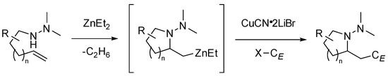 - Mickelsen, K.; Zabawa, S.; Livinghouse, T. Diethylzinc-Mediated Metalloamination–Alkylation of N,N-Dimethylhydrazinoalkenes Catalysis of C–Zn Alkylation Using Simple Cu(I) Salts. Synlett 2018, 29, 181–184. [Google Scholar] [CrossRef]