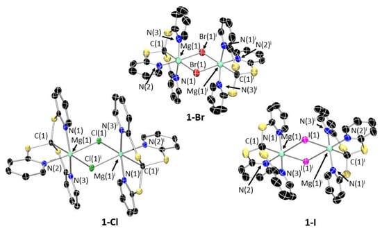 X-ray crystal structures of 1-X (X = Cl, Br, I). Ellipsoids are set at 50% probability level, and hydrogen atoms and lattice solvent molecules have been excluded for clarity. The figures have been reproduced as dimers to fully illustrate the geometry. C: black; N: blue; S: yellow; Mg: aquamarine; Cl: green; Br: brown; I: purple. 1-Cl: The asymmetric unit contains one monomer and half a molecule of benzene. Symmetry operation used to generate equivalent atoms: i = –x, 0.5 + y, 0.5 − z. Selected bond lengths (Å) and angles (°): Mg(1)–C(1) 2.427(11), Mg(1)–N(1) 2.186(11), Mg(1)–N(2) 2.204(10), Mg(1)–N(3) 2.193(11), Mg(1)–Cl(1) 2.427(5), N(1)–Mg(1)-N(2) 87.1(4), N(2)-Mg(1)-N(3) 94.1(4), C(1)-Mg(1)-Cl(1) 178.9(4). 1-Br: The asymmetric unit contains two monomers. Symmetry operation used to generate equivalent atoms: i = 1 − x, 2 − y, 1 − z. Selected bond lengths (Å) and angles (°): Mg(1)-C(1) 2.231(11), Mg(1)-N(1) 2.219(9), Mg(1)-N(2) 2.155(9), Mg(1)–N(3) 2.182(9), Mg(1)–Br(1) 2.821(4), N(1)–Mg(1)–N(2) 92.9(3), N(2)–Mg(1)–N(3) 92.1(3), C(1)–Mg(1)–Br(1) 94.2(3). 1-I: Symmetry operation used to generate equivalent atoms: i = 2 − x, 1 − y, 1 − z. Selected bond lengths (Å) and angles (°): Mg(1)–C(1) 2.231(10), Mg(1)-N(1) 2.182(8), Mg(1)–N(2) 2.177(8), Mg(1)–N(3) 2.177(8), Mg(1)–I(1) 2.855(3), N(1)–Mg(1)-N(2) 95.8(3), N(2)–Mg(1)–N(3) 93.5(3), C(1)–Mg(1)–I(1) 177.4(3).
