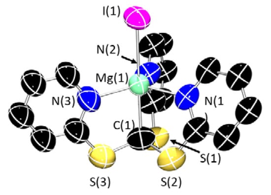 In one instance, we were able to obtain the molecular structure of the THF adduct [Mg(Tptm)(I)(THF)] (1-I∙THF); 1-I∙THF also adopts an octahedral geometry about magnesium, featuring the iodide ligand in an apical position in trans to the methanide carbon (Figure 5), analogously to monomeric 1-I. The Mg–C distance [2.265(15) Å] is slightly longer than in unsolvated 1-I, but still within the range of the values above. The Mg–Npy bond distance [2.213(13)–2.232(12) Å] is also slightly longer than the dimeric form but within the typical range [30,31].