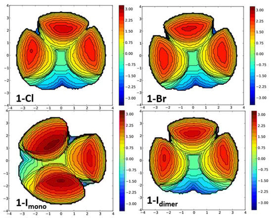Steric map of the Tptm in 1-X (dimeric, clockwise from top left: X = Cl, Br, I), and monomeric 1-I (bottom left). Generated from buried volume calculations with a coordination sphere of 3.5 Å.