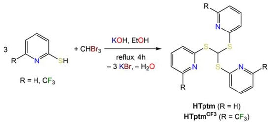 The proligand tris(2-pyridylthio)methane (HTptm) was synthesized following minor modifications of literature methods reported by Parkin and co-workers (Scheme 1) [15]. The preparation of HTptm was first reported by de Castro et al., who followed a slightly different methodology [26], though we could not reproduce their yields. It is also noteworthy that Kinoshita et al. used a different approach for the preparation of HTptm, which involved sonication of the reaction mixture and shorter reaction times. We were able to reproduce Parkin’s methodology very reliably and adapted their methods for synthesizing a more sterically demanding version of this architecture, comprising CF3 substituents in the 6-position on the pyridyl arms, i.e., HC[S{C5H3N(CF3)-6}]3 (HTptmCF3). However, its synthesis proved to be significantly more challenging than that of HTptm; our methodology affords HTptmCF3 in very poor yields (ca. 5%) therefore, it could only be made in small quantities sufficient for its full spectroscopic characterization.