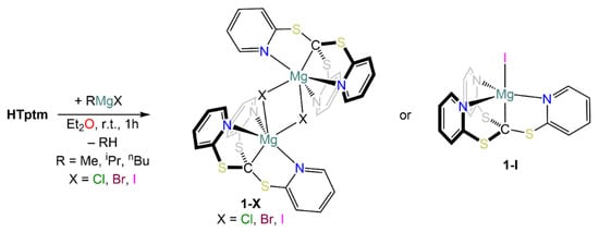 We then decided to use a different approach for the synthesis of magnesium complexes involving a single-step protonolysis reaction. Protonolysis methodologies involving Grignard reagents are a common synthetic strategy in AE coordination and organometallic chemistry [29]. Hence, HTptm was reacted with selected Grignard reagents (i.e., iPrMgCl, MeMgBr and MeMgI) in diethyl ether at room temperature (Scheme 3), producing the target complexes [Mg(Tptm)(Cl)] (1-Cl), [Mg(Tptm)(Br)] (1-Br) and [Mg(Tptm)(I)] (1-I) with the concomitant formation of propane or methane. In all cases, the target compounds were obtained in excellent yields (>90%), and their formulations were confirmed via elemental analyses.