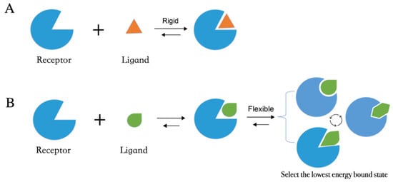 Two models of molecular docking. (A) A lock-and-key model. (B) Induced fit model.