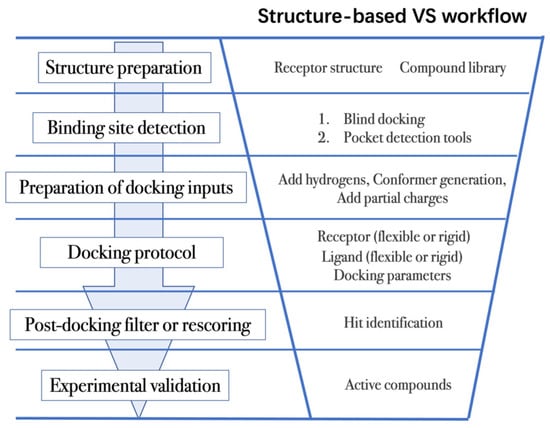 Structure-based VS relies on docking of large collections of compounds into the binding pocket of target protein, and then evaluating whether the protein–ligand contacts will drive binding. As shown in Figure 3, the general VS workflow can be as follows: