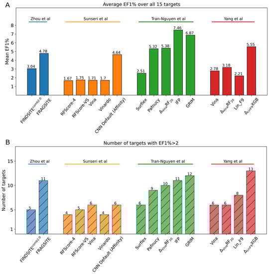 Collected LIT-PCBA benchmark test results from four different groups (Zhou et al. [197], Sunseri et al. [90], Tran-Nguyen et al. [198] and Yang et al. [103]). (A) Average enrichment factor at top 1% (mean EF1%) is used to evaluate the early hit enrichment performance. (B) Counting number of targets that satisfy the thresholds of EF1% > 2 as a metric to assess the generalizability of the scoring functions on all 15 diverse targets.