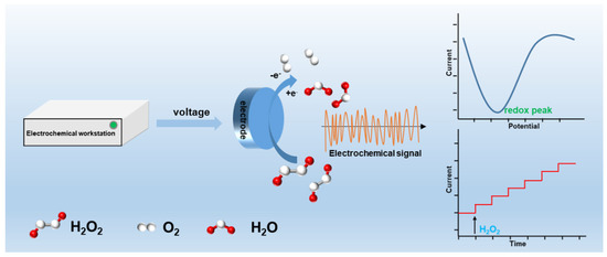 Generally, the electrochemical detection of H2O2 is achieved by applying a corresponding voltage to the electrochemical sensor, followed by the oxidation or reduction of H2O2 on the electrode surface. The electric charges of the redox process are captured by the electrode and converted into an electrochemical signal. Qualitative and quantitative analysis of H2O2 can be obtained through the change in the peak voltage and current. The schematic diagram of electrochemical detection of H2O2 is shown in Figure 2. Commonly, H2O2 detection is performed under neutral or alkaline conditions, with certain differences in the reaction mechanism. Specifically, the difference lies in whether the catalyst produces a reducing or oxidizing effect on H2O2 during the detection: if the catalyst appears in an oxidized state, the H2O2 is oxidized; and if the catalyst is in a reduced state, the H2O2 is reduced. We will discuss the specific steps of H2O2 catalytic decomposition in the following sections.
