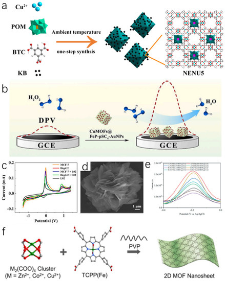 (a) Schematic illustration of the synthesis procedure for NENU5-KB composites [58]; Copyright 2018, Wiley. (b) Schematic illustration of the electrocatalytic reaction of H2O2 catalyzed by CuMOFs@FeP-pSC4-AuNPs; (c) CV responses of H2O2 with different cells [57]; Copyright 2021, Elsevier. (d) SEM image of Ni–MOFs [9]; Copyright 2019, Elsevier. (e) DPV curves of A(B)-NixMoy-MOFs@AAC sensors [63]; Copyright 2020, Royal Society of Chemistry. (f) Scheme showing the surfactant-assisted bottom-up synthesis of 2D MOF nanosheets [127]. Copyright 2017, ACS.
