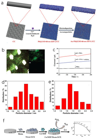 (a) Schematic diagram of the synthesis of Au–Pd@UiO-66-on-ZIF-L on CC; (b) Fluorescence spectra of A549 cells grown on Au–Pd@UiO-66-on-ZIF-L/CC stained by Calcein-AM (green) and PI (red); (c) Amperometric responses of the Au–Pd@UiO-66-on-ZIF-L/CC electrode to H2O2 secreted from living A549 cells under drug stimulation at 0.6 V [67]; Copyright 2021, Royal Society of Chemistry. (d) Particle size distributions of AgNPs in AgNPs@Y-1,4-NDC-MOF/ERGO and (e) CuNPs in CuNPs@Y-1,4-NDC-MOF/ERGO [62]; Copyright 2018, Elsevier. (f) The fabrication of the electrochemical sensor for the detection of H2O2 [64]. Copyright 2021, Wiley.