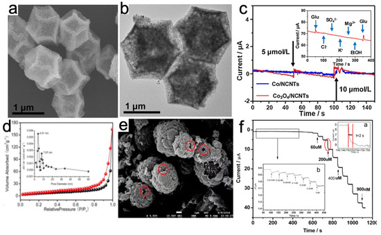 MOFs are often treated as self-sacrificing metal-organic precursors by post-treatment or high-temperature pyrolysis to construct well-defined heteroatom-doped carbonaceous microstructures with specific surface properties. A variety of typical 3D MOFs such as Prussian Blue, MOF-5, ZIF-67, and HKUST (Hong Kong university of science and technology, also called MOF-199)-1 are widely used as precursors or templates to build novel energy storage structures [135,136,137,138,139,140]. Furthermore, it has been reported that the carbon hybridization of transition metal oxides can not only improve the electrical conductivity of the catalyst, but also effectively prevent the aggregation of the catalyst. Therefore, transition metal oxides are often used as precursors for MOF derivatives [141,142,143]. Firstly, transition metal oxides are often used to provide active sites for enzyme-free detection and improve the activity of catalysts. Secondly, in situ formed CNT framework can improve the electronic conductivity, which is beneficial to the mass transfer of target molecules. Thirdly, the encapsulated carbon shell can effectively immobilize the oxidized nanoparticles, thereby inhibiting their aggregation. Qin’s [144] group successfully pyrolyzed the MOFs and fabricated hollow frameworks of Co3O4/n-doped carbon nanotubes (Co3O4/NCNTs) in air. It indicated that Co3O4 nanoparticles supplied active sites for the enzyme-free detection of H2O2, and the in situ formed carbon nanotube framework enhanced the electronic conductivity and accelerated the mass transfer of target molecules (Figure 6a). The encapsulated carbon shell could potently immobilize the oxidized nanoparticles, thus inhibiting their aggregation (Figure 6b). The established hollow frameworks exhibited excellent bifunctional detection capability with high sensitivity and low detection limitation for H2O2 (87.40 μA (mmol/L)−1 cm−2, 1 mmol/L) and glucose (5 mmol/L) (Figure 6c). This provides an effective idea for the establishment of non-enzymatic sensors with multifunctional detection for biological applications. In addition to the Co3O4/NCNTs hollow frameworks, Cui et al. [145] successfully synthesized hollow mesoporous CuCo2O4 (meso-CuCo2O4) microspheres and utilized them in both H2O2 sensors and glucose biofuel cells (GFCs) for the first time (Figure 6d,e). Meanwhile, the nitrogen adsorption-desorption isotherm of meso-CuCo2O4 was a type IV isotherm, confirming the existence of mesoporous structure and the intrinsic high specific surface area. On this basis, the inherently high catalytic activity of mesophase Cuco2o4 exhibits high sensitivity and low detection limit (3 nM) for H2O2 (Figure 6f). This further demonstrates that tunable porous structure can be constructed through MOFs template sacrificial method. Meanwhile, more metals active sites can be loaded with the increased surface area. It should be noted is that the calcination temperature needs to be preciously controlled, in order to prevent the potential issues of agglomeration and resulting reduced catalytic activity.