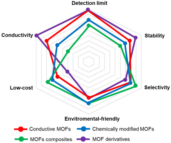 In summary, we listed the advantages and disadvantages (such as conductivity, catalytic activity, stability, selectivity cost and environmental friendliness) of conducting MOFs, chemically modified MOFs, MOFs composites and MOF derivatives (Figure 7). We consider that the ideal electrochemical sensors for H2O2 need to have the features of high conductivity, excellent catalytic activity, high selectivity, long-time stability, low cost, and environmental friendliness.