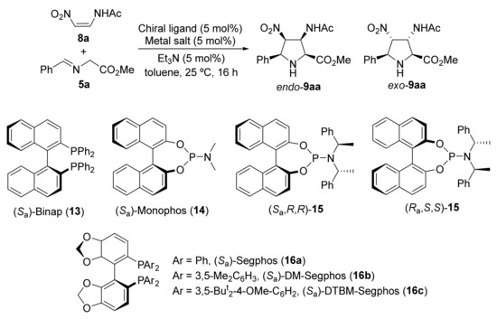 According to the experience of our group related to the synthesis of enantiomerically enriched nitroprolinates [45,46,47,48,49], we employed a catalytic system formed by several ligands (5 mol%) and silver(I) or copper(I) salts (5 mol%). They were mixed in toluene and stirred for 30 min. After the generation of the catalytic active species, the imino ester 5a and the dipolarophile 8a were added. At the end, triethylamine (5 mol%) was added and the reaction was allowed to react for 16 h at room temperature (25 °C) (Scheme 3). This model reaction was studied, and the effects of several parameters are shown in Table 1. Several ligands as (Sa)-Binap (13), (Sa)-Monophos (14), (Sa)-Segphos (16a), and its derivatives (Sa)-16b and (Sa)-16c were tested, offering very low chemical yields of the cycloadducts 9aa (Table 1, entries 1, 2, and 4–6). However, phosphoramidite (Sa,R,R)-15 in combination with silver perchlorate afforded a high endo-diastereoselection (88:12), good chemical yield (77%), and excellent ee of the endo-9aa cycloadduct (Table 1, entry 3). Copper(I) salts were not appropriate for this 1,3-DC, giving almost null conversions of the expected product (Table 1, entries 7–10). The match-mismatch combination of the two chiral environments present in ligand 15 was analyzed, finding that (Sa,R,R)-15 better furnished dr and ee than the (Sa,S,S)-15 phosphoramidite (Table 1, entry 11). The employment of the (Ra,S,S)-15 ligand afforded the opposite enantiomer in the same yield and diastereoselectivity (Table 1, entry 12). The screening of the silver salts was performed next (Table 1, entries 13–20). AgOTf and AgOAc afforded very close results of the major endo-9aa compound but never improved the analogous one obtained in the reaction involving AgClO4 (Table 1, entries 13 and 17). In the example run with basic silver acetate, in the absence of triethylamine, the ee of endo-9aa was very low (Table 1, entry 14). Despite the higher dr (92:8) and identical ee obtained for endo-9aa, the reaction performed at 0 °C occurred in a lower yield than the process run at room temperature (Table 1, entry 21). The employment of THF, acetonitrile, or DCM instead of toluene as solvent, or substitution of triethylamine by DABCO or diisopropylethylamine (not shown in Table 1), did not improve the data achieved by the reaction depicted in entry 3 of Table 1.