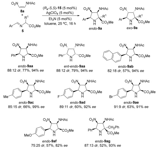 As described before, the enantiomerically enriched ent-endo-9aa was obtained employing chiral ligand (Sa,R,R)-15 in a 79% yield and 94% ee (Table 1, entry 3, Scheme 4). The presence of different aromatic substituents at the imino group afforded good yields of the corresponding endo-cycloadducts 9aa–9af. In each example, the major diastereoisomer was isolated with a very high enantioselectivity (up to 99% ee achieved for endo-9ac). The phenylalanine-derived imino ester 5g was also appropriate to run the transformation, generating the prolinate derivative endo-9ag in a 52% yield, 87:13 dr, and with 93% ee (Scheme 4).
