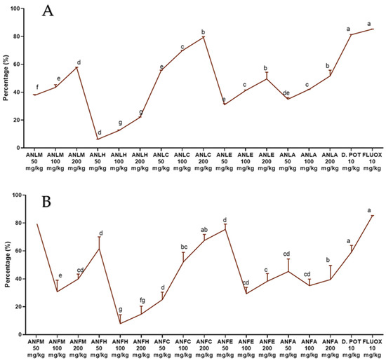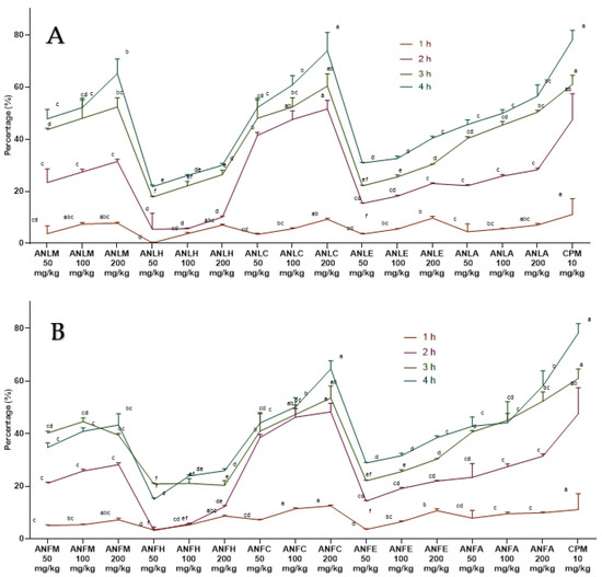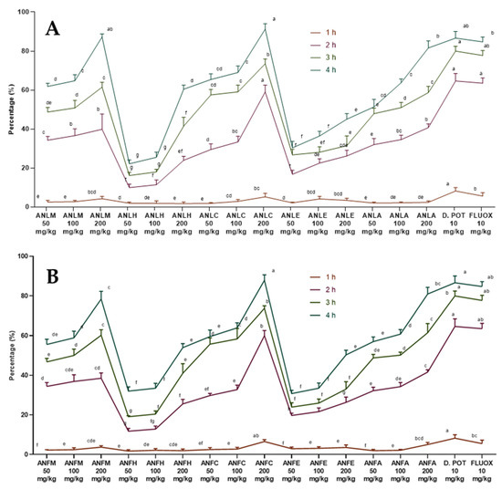 Percentage inhibition of A. nitida on carrageenan-induced paw edema in rats (A) A. nitida leaves methanolic extract (ANLM), A. nitida leaves n-hexane fraction (ANLH), A. nitida leaves chloroform fraction (ANLC), A. nitida leaves ethyl acetate fraction (ANLE), A. nitida leaves aqueous fraction (ANLA), and (B) A. nitida fruit methanolic extract (ANFM), A. nitida fruit n-hexane fraction (ANFH), A. nitida fruit chloroform fraction (ANFC), A. nitida fruit ethyl acetate fraction (ANFE), A. nitida fruit aqueous fraction (ANFA). D.POT: Diclofenac potassium; FLUOX: Fluoxetine. Data were analyzed using seven replicates as mean ± SD by a two-way ANOVA followed by Bonferroni’s test. Different letters represent the significance level of p < 0.05 with respect to all other samples “a, b” with reference to positive controls, “c” with reference to methanolic extract and “d, e, f, g” with reference to n-hexane, chloroform, ethyl acetate and aqueous fractions, respectively.
