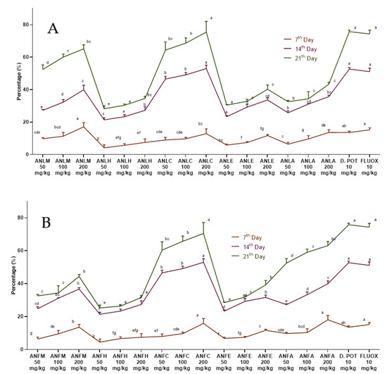 The observations obtained from this test are reported in Figure 2 and Tables S3 and S4. After edema induction (14 days), ANLC and A. nitida fruit chloroform fraction (ANFC) at all doses (50, 100 and 200 mg/kg) showed markedly (p < 0.01) decreased edema. The edema was further significantly (p < 0.01) repressed after 21 days by chloroform, methanol and aqueous fractions of A. nitida leaves and fruit. However, multiple comparisons of many treatments showed that ANLC and ANFC at 200 mg/kg almost equally decreased in edema, as shown by diclofenac potassium and fluoxetine. However, the decrease in edema of these dosages was considerably higher (p < 0.01) relative to other samples.