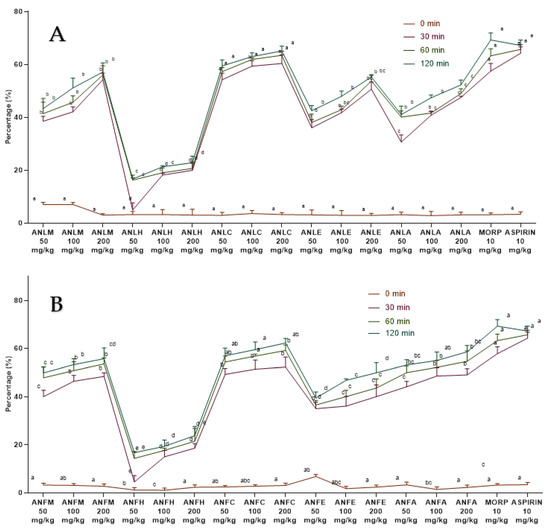 Percentage inhibition of A. nitida on hot plate test in rats (A) A. nitida leaves methanolic extract (ANLM), A. nitida leaves n-hexane fraction (ANLH), A. nitida leaves chloroform fraction (ANLC), A. nitida leaves ethyl acetate fraction (ANLE), A. nitida leaves aqueous fraction (ANLA) and (B) A. nitida fruit methanolic extract (ANFM), A. nitida fruit n-hexane fraction (ANFH), A. nitida fruit chloroform fraction (ANFC), A. nitida fruit ethyl acetate fraction (ANFE), A. nitida fruit aqueous fraction (ANFA). MORP: morphine. Data were analyzed using seven replicates as mean ± SD by two-way ANOVA followed by Bonferroni’s test. Different letters represent the significance level of p < 0.05 with respect to all other samples “a, b” with reference to positive controls, “c” with reference to methanolic extract and “d, e, f, g” with reference to n-hexane, chloroform, ethyl acetate and aqueous fraction, respectively.