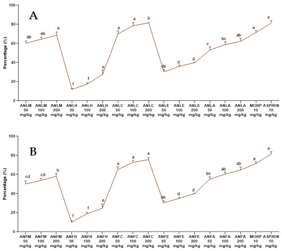 The ANLM and its resulting fractions ANLC and A. nitida leaves aqueous fraction (ANLA) considerably (p < 0.01) and dose-dependently (50, 100 and 200 mg/kg) decreased the number of abdominal contractions tempted after the acetic acid administration to the rats. The preventive effect of aspirin and morphine was non-considerably different from the defensive effect after exposure by ANLC and ANLM (50, 100 and 200 mg/kg) (Figure 6A and Table S11). Similar results were recorded for ANFC with 75.62 ± 2.06% inhibition of writhing (Figure 6B and Table S12). The writhing test in mice is regarded as being relatively reliable for the experimental evaluation of analgesic agents. However, using rats may have limitations as the challenge of the irritant can’t be repeated at short intervals and chronic challenges of irritants may cause injury to abdominal organs [28].
