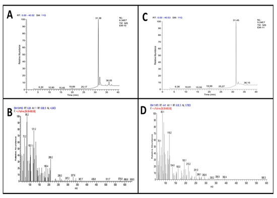 GC-MS graph presenting retention time and m/z ration (A) leaves retention time and (C) fruits retention time, (B) leaves m/z ration and (D) fruit m/z ration.