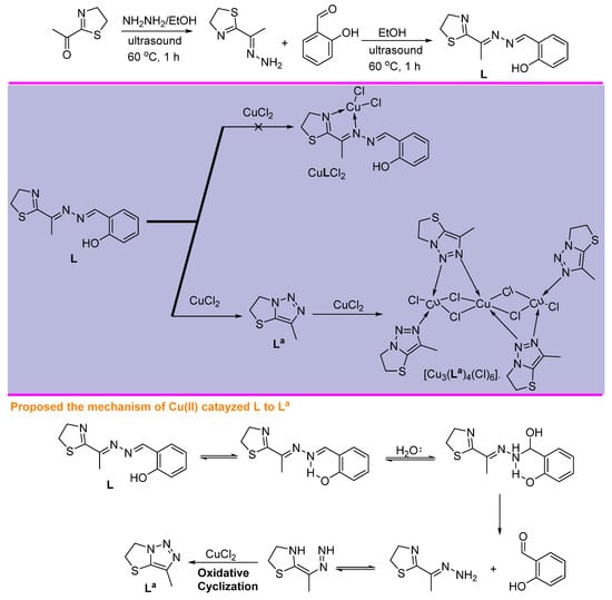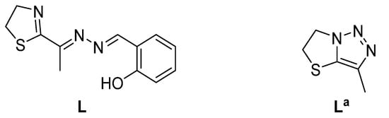 Structure of the presented ligands 1-(((4,5-dihydrothiazol-2-yl)ethylidene) hydrazone)methyl)phenol, L, and 3-methyl-5,6-dihydrothiazolo[3,2-c][1,2,3]triazole, La.