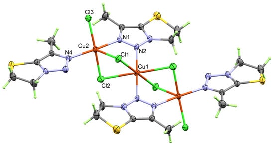 The designed ligand L was synthesized according to the method depicted in Scheme 1. The acetyl derivative reacted with hydrazine, followed by reaction with salicylaldehyde to give the corresponding Schiff base L. The reaction of CuCl2·2H2O with 2-(1-(4,5-dihydrothiazol-2-yl)ethylidene)hydrazone)methyl)phenol L did not proceed to the formation of the corresponding Cu(II)–hydrazone complex. Unexpectedly, the hydrazone ligand underwent oxidative hydrolysis, followed by cyclization, affording the corresponding thiazolidine La, which proceeded to complexation with the Cu(II) ion, affording the trinuclear [Cu3(La)4(Cl)6] complex (Scheme 1). Spectral characterizations of the synthesized compounds are presented in Figures S1–S6 (Supplementary Materials). The structure of the novel Cu(II) complex was confirmed using elemental analysis, different spectroscopic measurements, and X-ray crystallography. The antimicrobial, anticancer, and antioxidant activities of the [Cu3(La)4(Cl)6] complex were also presented.