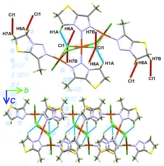 The structure of [Cu3(La)4(Cl)6] is stabilized by an intramolecular C1-H1A∙∙∙Cl1 interaction, with hydrogen–acceptor and donor–acceptor distances of 2.72 and 3.427(5) Å, respectively. Its packing is dominated by the weak non-covalent C-H∙∙∙Cl interactions depicted in Table 3 and shown as a red dotted line in the upper part of Figure 3. A view of the packing through the bc plane, showing the complex units connected by the Cl-H∙∙∙O interactions, is presented in the lower part of the same illustration. The donor–acceptor interaction distances range from 3.609(5) Å (C6-H6A∙∙∙Cl1) to 3.692(5) Å for C7-H7B∙∙∙Cl1, respectively.