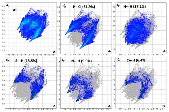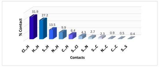 The fingerprint plots are demonstrated in Figure 5. The complementary regions in these plots are visualized, where one molecule behaves as a donor (de > di), while the other acts as an acceptor (de < di). The fingerprint plots highlight the close contacts of specific atom pairs. Thus, selected contributions can account for the stability of the complex crystal structure. The Cl∙∙∙H contacts have the largest contribution in the molecular packing and also have short Cl∙∙∙H distances of 3.49, 3.39, 3.036, 2.87, and 2.81 Å, corresponding to Cl2∙∙∙H1B, Cl1∙∙∙H6B, Cl3∙∙∙H7B, Cl2∙∙∙H6B, and Cl1∙∙∙H7B, respectively. The S∙∙∙H contacts have a relatively strong contribution to the stability of the crystal structure, within the range of 3.22 to 3.43 Å. The proportion of Cl∙∙∙H, H∙∙∙H, S∙∙∙H, and N∙∙∙H interactions comprises 31.9%, 27.2%, 13.5%, and 9.9% of the total Hirshfeld surface, respectively (Figure 6). These are the important interactions which stabilize the crystal structure of the [Cu3(La)4(Cl)6] complex.