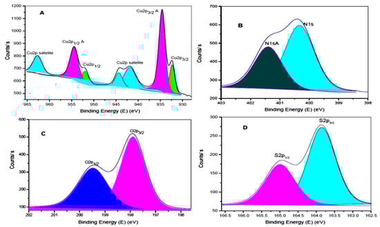 XPS diagram showing binding energy peaks for: (A) copper(II) ion in the complex as: Cu2p1/2 A, Cu2p3/2 A (magenta color), Cu2p1/2, Cu2p3/2 (green color), and Cu2p satellites (cyan color), (B) N1s (cyan color), N1sA (dark cyan color), (C) Cl2p3/2 (magenta color), Cl2p1/2 (blue color), and (D) S2p1/2 (magenta color), and S2p3/2 (cyan color).