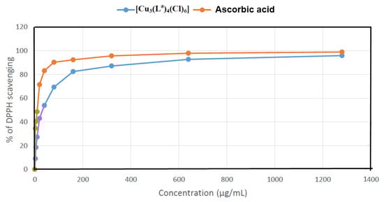 The antioxidant activity of the [Cu3(La)4(Cl)6] complex was determined using the DPPH (2,2-diphenyl-1-picryl-hydrazyl-hydrate) method (Figure 8). The percentage of DPPH was determined to be 95.84 at 1280 (µg/mL). Additionally, the IC50 value of the [Cu3(La)4(Cl)6] complex was determined to be 32.95 ± 1.43 (µg/mL). Under the same experimental circumstance, the reference ascorbic acid has IC50 of 10.62 ± 0.84 µg/mL. Thus, the Cu(II) complex showed a relatively reasonable antioxidant activity compared to the reference compound.