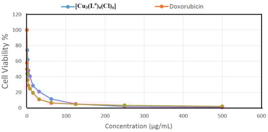 The [Cu3(La)4(Cl)6] complex was tested for its in vitro cytotoxicity against colon carcinoma (HCT-116 cell line). The results of the cytotoxicity experiments are presented graphically in Figure 9. These results showed an extraordinary cytotoxicity against the examined cell line (HCT-116). The percentage of the cell viability is only 0.93 µg/mL at 500 µg/mL, while the IC50 value is 3.75 ± 0.43 µg/mL. For doxorubicin as a positive control and under the same experimental conditions, the IC50 value is 0.49 ± 0.07 µg/mL. Consequently, this Cu(II) complex has a very promising inhibitory activity against colon carcinoma.