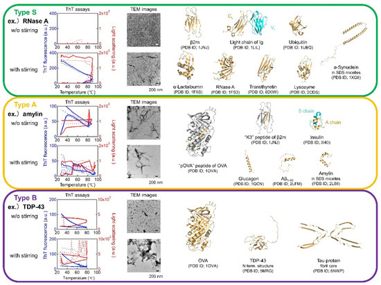 Type S proteins: The first type of protein shows a strict dependence on agitation for amyloid formation at high temperatures. Noji et al. [78] call this transition the “strictly supersaturation-dependent transition” or “S transition”. Proteins exhibiting S transitions include those with a native conformation (β2m, variable (VL) and constant (CL) domains of antibody light chain, HEWL, and ribonuclease A (RNaseA)) and αSyn. Most interestingly, wild-type RNaseA forms amyloid fibrils upon heating under stirring. The hinge-loop-expanded mutant of RNaseA was reported to generate amyloid-like fibrils via 3D domain swapping, whereas the wild-type RNaseA did not [79,80]. Transthyretin (TTR) at pH 2.0 and 0.1 M NaCl can also be included in Type S, although TTR at a neutral pH tends to form amorphous aggregates [81].