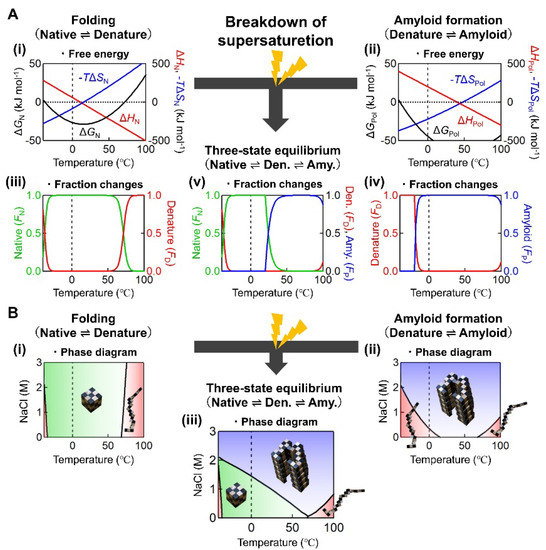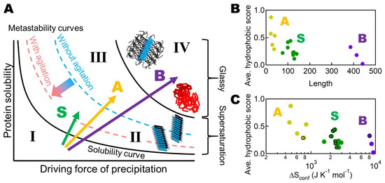 Noji et al. [78] showed that these three types (S, A, and B) of transitions with distinct responses to heating can be located on a general aggregation phase diagram, based on the driving forces of precipitation and protein solubility [12,84,85] (Figure 4A). The S, A, and B transitions are indicated by green, orange, and purple arrows, respectively. This type of diagram is often used to illustrate the crystallization and amorphous precipitation of native proteins and, moreover, for solutes in general (Figure 1) [10].