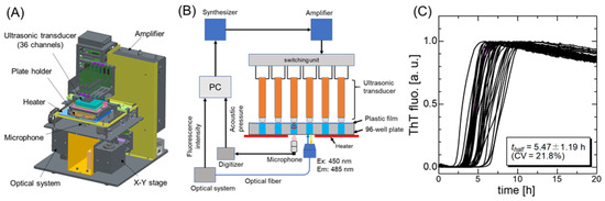 Nakajima et al. [98] developed a HANABI-2000 system with an optimized sonoreactor for the amyloid-fibril assay, which improved the reproducibility and controllability of the amyloid fibril formation [95] (Figure 5). First, the water bath was eliminated in order to achieve a reproducible analysis. A single rod-shaped ultrasonic transducer was placed on each sample solution in an assay plate. The resonant frequency of the transducer was 30 kHz, which was optimized for accelerating amyloid fibril formation [99]. Second, a microphone was placed below the assay plate to measure the acoustic intensity of each sample solution. The acoustic intensity measurement allows for the acoustic field in each well to be controlled by individually regulating the voltage and frequency of the driving signal applied to each transducer. Third, a photodetector was placed beneath the microplate to measure the fluorescent signal, which improves the signal-to-noise ratio of the fluorescence measurement because of the absence of the water bath.
