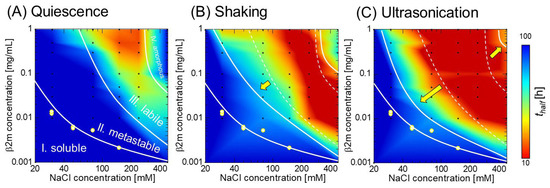 thalf heat maps of aggregation reactions. (A) Under quiescence, (B) under shaking, and (C) under ultrasonication. The yellow dots denote the solubility of acidic β2m monomer at each salt concentration, determined by ultracentrifugation and the ELISA assay. The dotted lines in panels (B,C) indicate the phase boundaries under quiescence, which are varied under agitation as indicated by yellow arrows. The figure is reproduced from Nakajima et al. [104] with permission. Copyright 2021 American Chemical Society.