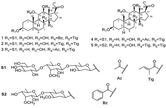 - Si, Y.; Sha, X.S.; Shi, L.L.; Wei, H.Y.; Jin, Y.X.; Ma, G.X.; Zhang, J. Review on pregnaneglycosides and their biological activities. Phytochem. Lett. 2022, 47, 1–17. [Google Scholar]