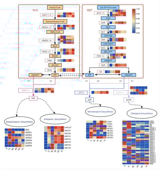 - Ali, M.; Hussain, R.M.; Rehman, N.U.; She, G.; Li, P.; Wan, X.; Guo, L.; Zhao, J. De novo transcriptome sequencing and metabolite profiling analyses reveal the complex metabolic genes involved in the terpenoid biosynthesis in Blue Anise Sage (Salvia guaranitica L.). DNA Res. 2018, 25, 597–617. [Google Scholar] [CrossRef] [PubMed]