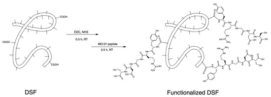 Scheme showing the synthetic pathway for activating -COOH residues on DSF and their reaction with the N-terminal amino group of MO-07 peptide.