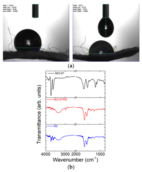 The contact angles of DSF and MO-07-modified DSF were measured after placing a water droplet onto the fibres. A water droplet of about 5 µL was applied, and photographs were taken at an interval of 5 s. The contact angles were measured in a goniometer (FTÅ200, First Ten Ångstroms, Inc., Portsmouth, NH, USA) using the FTÅ Drop Shape Analysis Software, Version 2.0 (2002, Portsmouth, NH, USA).