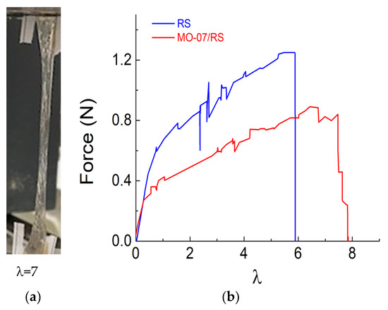 (a) Photograph demonstrating the elongation of MO-07/RS film when stretched and (b) force as a function of strain ratio (λ) curves for the RS and MO-07/RS samples, respectively.