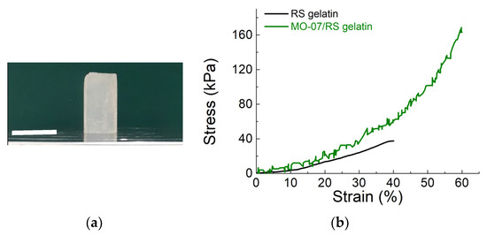 Compressive tests of the RS gelatin and MO-07/RS gelatin composite. (a) The MO-07/RS gelatin composite. The scale bar indicates 16 mm. (b) Stress-strain curves of RS gelatin and MO-07/RS gelatin composite.