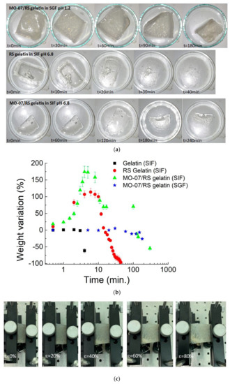 To simulate gastric fluid conditions (pH, 1.2), 2 g of NaCl and 8.3 mL of concentrated HCl were dissolved and adjusted to 1000 mL with water. Similarly, to simulate intestinal fluid (pH~6.8), 6.8 g of KH2PO4 and 0.896 g of NaOH were dissolved in water and adjusted to 1000 mL. Degradation was measured as the percent weight loss over time calculated as the difference between the initial and final weight normalised to the initial weight. To perform the dissolution study, gelatin-based RS and MO-07/RS were cut into pieces and submerged in 10 mL of either gastric or intestinal fluid at 37 °C at different times. Gelatin containing MO-07/RS was treated for 60 min. in gastric fluid at 37 °C, clamped between two grips, and strained from 5 mm to 25 mm.