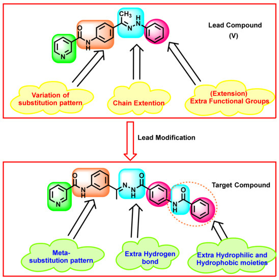 In the current work, compound V was used as a lead compound to do chemical modification at three sites. The first site is the phenyl ring of the linker moiety. The lead compound has a para disubstituted phenyl ring as the pharmacophore moiety is attached to the position 4 of the phenyl ring. In the modified compound, the pharmacophore moieties are attached to position 3 of the phenyl ring to become a meta-substituted derivative. This modification will change the orientation of the new compound and may facilitate its efficient binding in the active site. The second site is the pharmacophore moiety as we replaced the hydrazone moiety (in the lead compound) with the formylhydrazone one (in the modified compound). This modification may increase hydrogen bonding interaction at the DFG motif region. The third site at which a modification took place is the terminal hydrophobic tail. We applied the extension strategy (addition of extra function group). In this strategy, a benzamide moiety was substituted at position 4 of the terminal phenyl ring. This modification may increase the chance to form extra hydrophilic and hydrophobic interactions in the allosteric binding site (Figure 2).