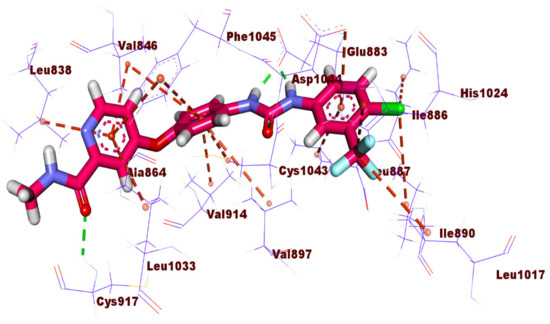 The obtained results of the docking process indicated that the outlined binding mode of sorafenib was consistent with what is reported in the literature [26] (Figure 4).